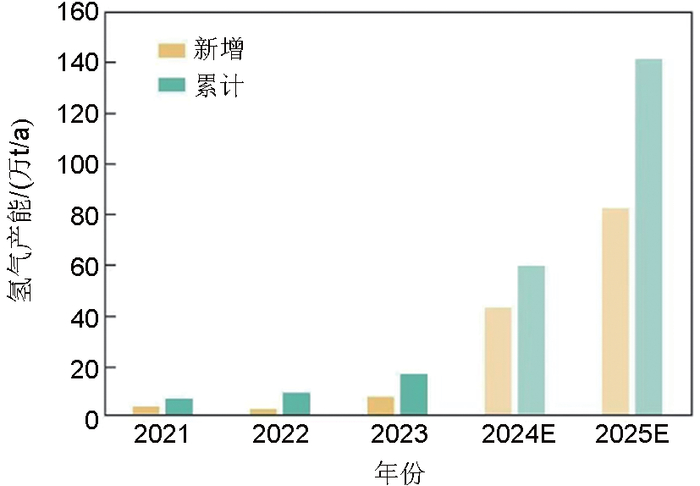 2023年以来,主要经济体陆续重构调整国家氢能发展战略,绿氢发展正在成为全球氢能行业关注的重点。上调绿氢发展目标,美国、日本、欧盟分别更新了《氢能基本战略》《可再生能源指令》、《美国国家清洁氢能战略和路线图》,提出到2030年绿氢消费分别增至2000、1200及1000万吨水平。截至2024年底,全球电解水制绿氢累计产能为29.2~32.2万t/a。目前,国外有超50项大型绿氢项目已通过决议待建设。欧盟等发达经济体对航运、化工等领域零碳燃料、原料提出新要求,将加速推动多项万吨级绿氢项目落地开工。预计到2025年底,全球绿氢累计产能或将增至140万t/a(图1)。