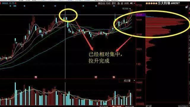 先是筹码在相对低位进行相应的吸筹!在一个相对集中的区域震荡,将市场上的筹码充分吸收,并非切筹码高度集中,这就证明庄家是完成筹码收集的过程,之后就是拉升!