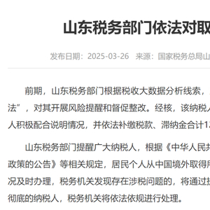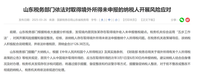 以山东税务部门公布的案例为例,当地税务部门根据税收大数据分析线索,发现境内居民张某存在取得境外收入未申报缴税疑点。税务机关综合运用“五步工作法”,对其开展风险提醒和督促整改。经核,该纳税人存在取得境外所得未依法申报缴纳个人所得税问题。在税务机关政策辅导后,该纳税人积极配合说明情况,并依法补缴税款、滞纳金合计126.38万元。