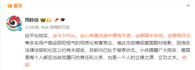 微博:多名用户攻击嘲讽爱国题材电影,已被禁言处理