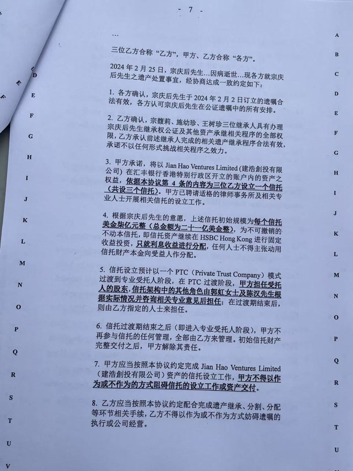 另外,协议中也要求原告三人要承认宗庆后于2024年2月2日订立的遗嘱,并配合执行,宗馥莉则必须为三子女完成信托设立,不得互相妨碍。