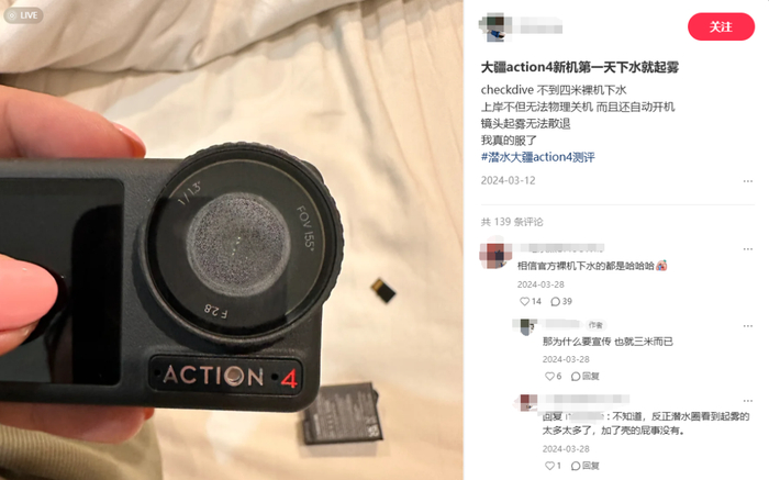 2024年3月,曾有小红书用户表示,大疆action4新机第一天下水就起雾。“不到四米裸机下水,上岸不但无法物理关机,而且还自动开机,镜头起雾无法散退,我真的服了。”