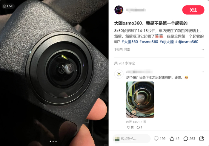 可发售后第二天,就有小红书有用户发布笔记称,自己购买的大疆Osmo 360存在镜头起雾问题。