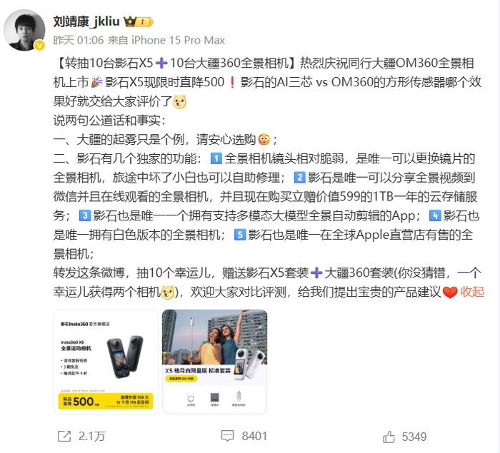 这事儿还没完。8月2日,影石创始人刘靖康在微博发文庆祝大疆新品上市,还抽奖送自家和大疆的相机,顺带补了句:“大疆的起雾只是个例,请安心选购。”
