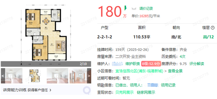 110平电梯2房2厅2卫 如今挂牌价180万还没卖掉。2021年 同户型最高成交价424万,跌去244万。