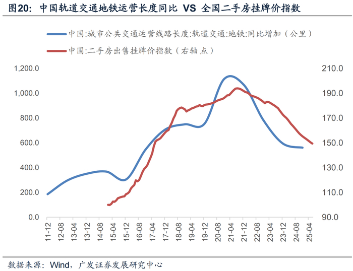 (4)最后值得注意的是,基建半径扩张对于房价的影响有两大途径。其一是基建(尤其是交通与公共设施)通过缩短通勤时间、提高生活便利度以改善城市区域可达性,显著提升周边土地溢价与房产价值(中国轨道交通地铁运营长度同比 VS 全国二手房挂牌价指数)。其次是城市半径扩张与产业、劳动力流入密切相关,即通过“产业—就业”循环形成人口集聚效应,扩大居民购房需求。我们在前述提到下半年城中村改造、城市基础设施更新是房地产市场的重要环节,若能进一步通过基建半径扩大住房需求基数,预计下半年一线及部分核心二线城市房价止跌回稳,全国口径房价环比跌幅放缓应较为确定。