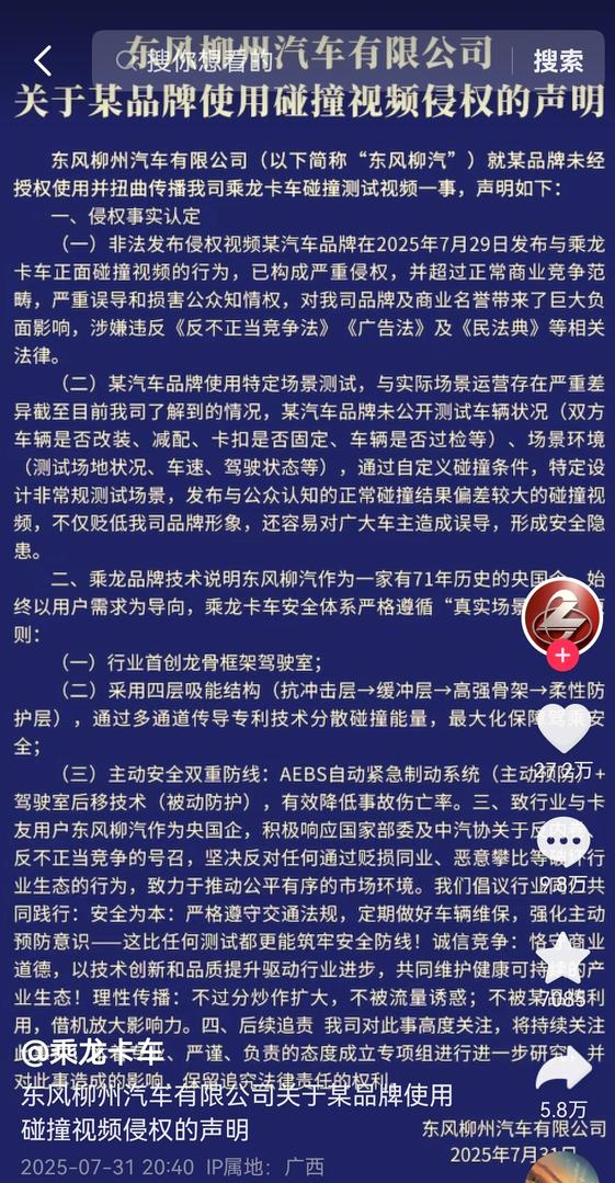 7月31日,乘龙卡车发布相关声明,称“某汽车品牌在2025年7月29日发布与乘龙卡车正面碰撞视频的行为,已构成严重侵权,并超过正常商业竞争范畴,严重误导和损害公众知情权,对公司品牌及商业名誉带来了巨大负面影响。”