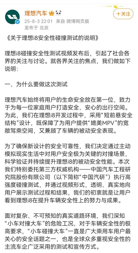 同时,理想汽车也发布《关于理想i8安全性碰撞测试的说明》称,测试目的只是为验证和提升理想i8的被动安全性能,并非针对其他任何品牌进行产品质量评价,测试结果也不应被解读为对其他品牌产品质量的论断。