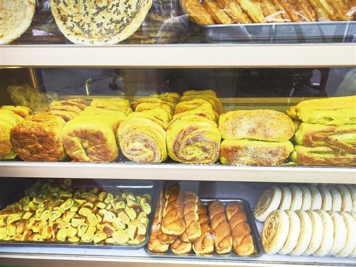 民勤街农贸市场“翔宇油锅盔”前,总是围满了挑馍的人。刚出炉的大饼金黄油亮,表面撒着白芝麻,用手一掰十分酥脆,内里却十分暄软,麦香混着炭火的焦香扑鼻。“这饼得用老面发,醒够三小时,烤的时候,炉膛温度差一度都不行。”老板拍着饼底,声音洪亮,“凉了也不硬,夹个卤肉、抹点辣酱,扎实!”旁边的锅盔分量很足,直径半尺的馍上印着简单的花纹,切开后能看到细密的分层,碱水的微香混着麦香,是老一辈人最认的“干粮”。除了白饼外,很受人们欢迎的还有甜油锅盔,里面混着各种馅料,外壳酥脆,香气四溢,口感十分丰富。