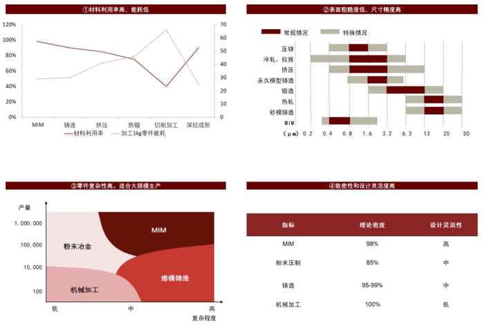 MIM结合了注塑成形和粉末冶金的技术优点,适用于高效、低成本地生产中小型的复杂制品。MIM综合了粉末冶金和塑料注塑成型两大技术的优点,既突破了传统金属粉末压制成形在产品形状上的限制,又继承了塑料注塑成形技术能大批量、高效率成形复杂零件的特点,相对于其他成型工艺优势显著。根据头豹研究院,MIM工艺具备如下特征:1)MIM材料利用率和加工1kg零件能耗分别为98%和29MJ,材料利用率较高且能耗较低;2)MIM烧结件的表面粗糙度约在0.3-2.4μm区间范围,表面粗糙度较低,尺寸精度较高;3)MIM可成型复杂度较高的零件,且由于模具成型的生产效率较高,MIM适合大批量规模化生产;4)MIM成型的理论密度约98%,致密性较高,且设计灵活性优于其他工艺。