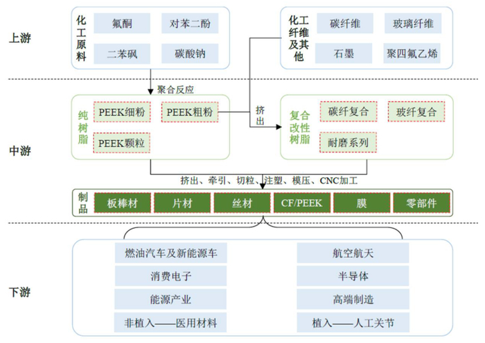 PEEK属于合成树脂制造行业,上下游产业链长。上游是化学原料和化学纤维制造行业,原材料主要包括氣酮(DFBP)、对苯二酚、二苯砜、碳酸钠等,通过聚合反应合成PEEK粉料;中游环节是通过对PEEK进行改性和调整产出纤维材料,并通过挤出、注塑等工艺加工为成品,使其适用于不同领域,满足各种环境和场景的需求;下游应用于交通运输、航空航天、电子信息、能源及工业、医疗健康等行业。