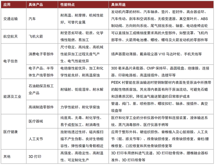 图表:PEEK应用领域及性能特点
