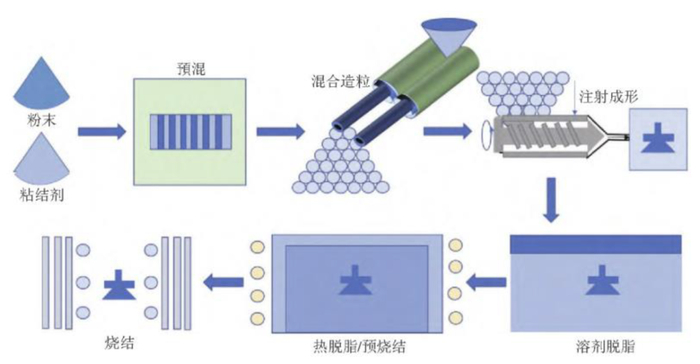 金属注射成形(metal injection molding, MIM)是一种新型粉末冶金成形技术,将金属粉末与粘结剂混合来进行注射成型。MIM技术的工艺流程是先将金属粉末与粘结剂混合制备成粒状喂料,再用注塑机将喂料注射成形为特定形状的生坯,最后将生坯进行脱脂、烧结,得到性能优异的复杂金属构件;或再经过后续的整形、表面处理、热处理、机加工等方式使产品更加完美。