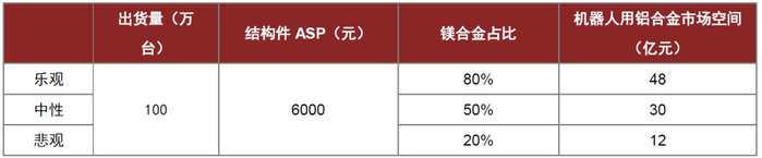 我们试图定量测算机器人带来的市场增量:假定未来单个人形机器人上结构件单机价值量达到6000元,乐观/中性/悲观情况下其中有80%/50%/20%为镁合金制品,则当人形机器人出货量100万台时,机器人用镁合金件市场空间分别为48/30/12亿元。