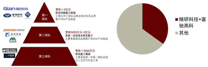 从中游看,行业格局相对分散。目前,我国MIM技术具有批量化程度高、效率高、一致性好等特点,已接近国际先进水平,尤其在自动化及生产工艺等方面与国际先进水平无异,部分技术领域甚至已经达到全球领先水平。中国MIM行业按照业务规模大小可划分为三大竞争梯队,其中处于第一梯队的精研科技和富驰高科占据了25-35%的市场份额,第二梯队的海昌新材等已经具备一定的规模化生产能力,行业集中度相对较低,整体竞争格局较分散,