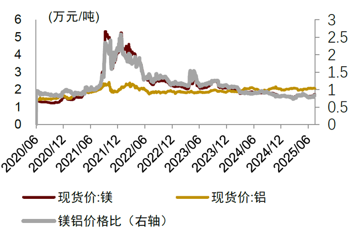 从上游看,宝武镁业扩产带动镁价迎平价时代,镁铝价格比已跌破1。2023年以来宝武镁业大幅度扩产,将产能从10万吨原镁+20万吨镁合金提升至50万吨原镁+50万吨镁合金的产能规模。供给侧宽松带动镁合金价格快速下行,2024年3月以来镁价持续低于铝价并持续下跌,截至2025年7月30日,镁铝价比下探至0.83。我们认为,铝镁价比下探带动镁合金铸件较铝合金铸件的性价比持续上升,镁合金有望在各个领域加速渗透。