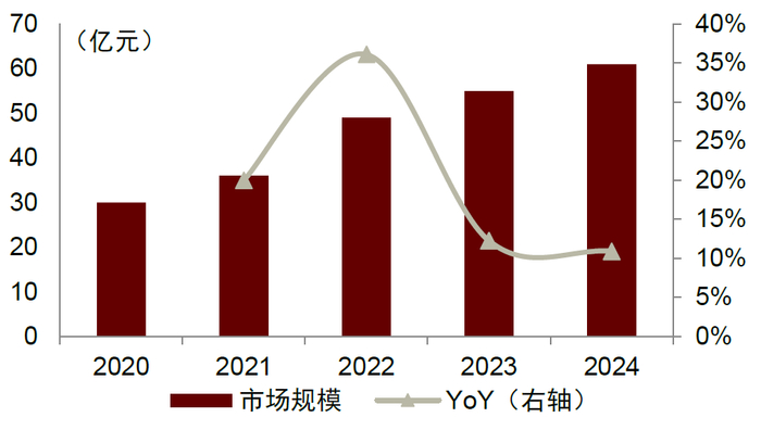从下游来看,PEEK材料已在汽车、航空、电子、工业、医疗等诸多行业广泛应用。伴随PEEK材料的性能和质量不断提高、成本持续下降,PEEK市场持续扩容,2020-2024年全球市场规模由30亿元增长至61亿元,中国市场规模由10亿元增长至19亿元。分市场来看,电子电气、汽车、航天是前三大应用领域,占到全球&中国市场的近七成。
