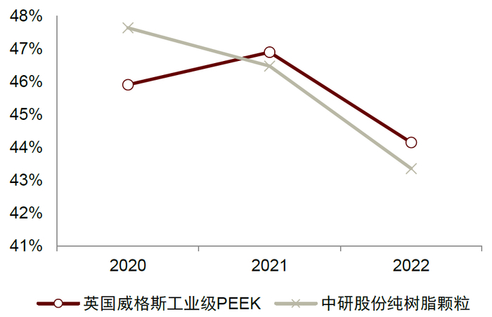图表:中研股份与威格斯PEEK产品毛利率对比