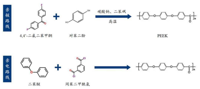 从中游看,PEEK材料壁垒高,尤其是聚合环节。自20世纪70年代末英国帝国化学工业(ICI)首次开发出PEEK粉料以来,行业内逐步形成亲核取代和亲电取代两种PEEK合成加工路线,前者反应易控、PEEK粉末纯度高但是成本高昂、工艺复杂,后者条件宽松、原料易得但是PEEK纯度低、环境不友好,因此行业以前者路线为主。整体而言PEEK材料加工壁垒高企,其中又以聚合反应的难度最大: