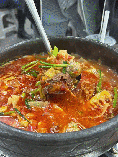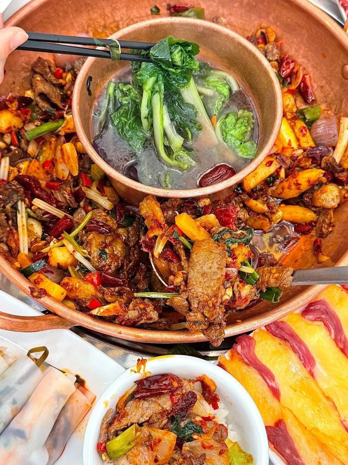 牛肉现炒,盖在萝卜条、豆皮、豆芽等新鲜蔬菜上,裹上香辣酱料,入口满满麻辣鲜香。