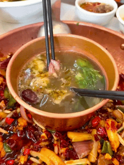 麻辣干锅一锅两吃,铜锅正中可以煮菜,牛骨汤十分解腻。