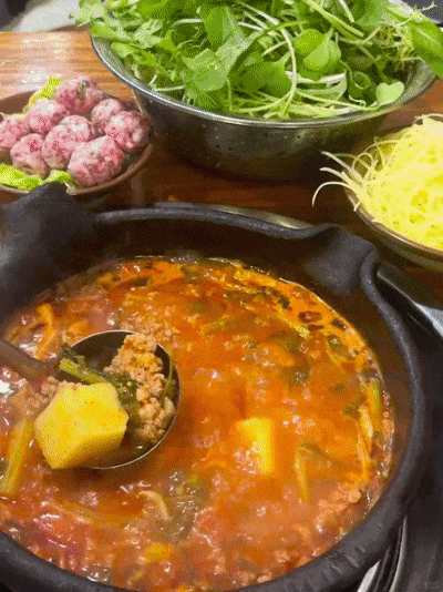 酸汤煮肉煮蔬菜煮软哨都好吃,而且越煮越香。煮到最后夺夺粉让汤底变得格外浓稠,拌上米饭香的飞起!