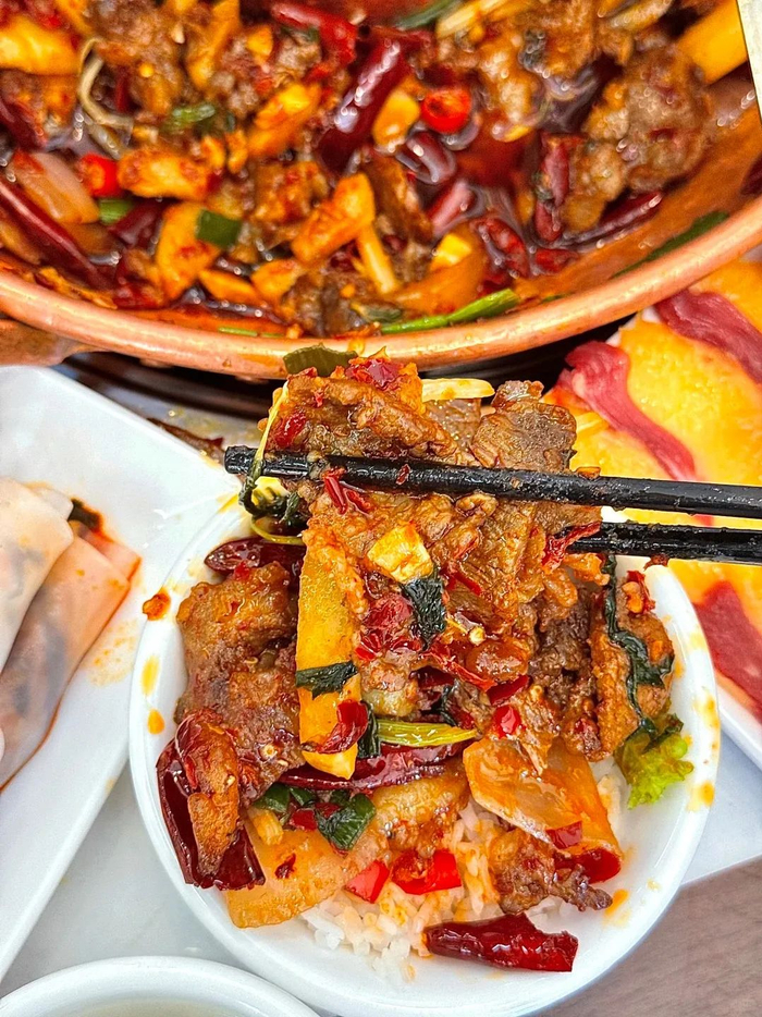 牛肉现炒,盖在萝卜条、豆皮、豆芽等新鲜蔬菜上,裹上香辣酱料,入口满满麻辣鲜香。