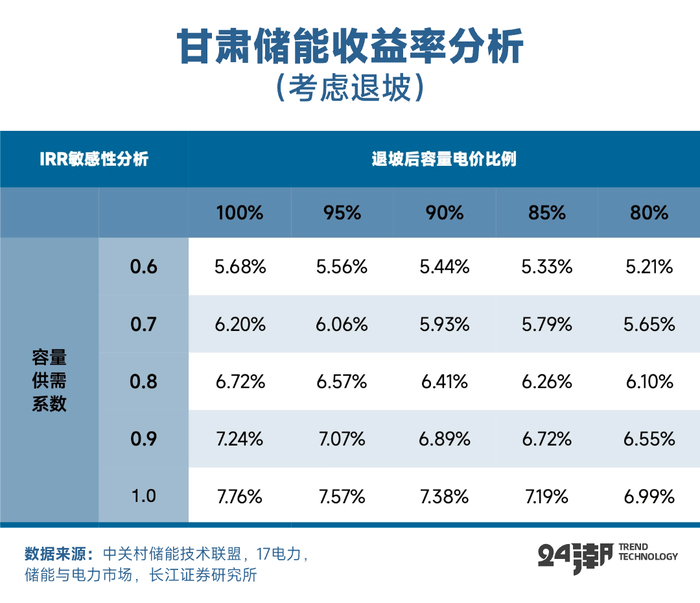 在国内市场,根据长江证券测算,假设独立储能电站容量若容量供需系数为0.7,若电价维持10年、两年后不退坡,仅靠现货市场套利全投资收益率为2.7%左右,叠加容量电价(容量电价:甘肃储能容量电价计费方式为:容量电费=申报容量×容量电价×容量供需系数;其中申报容量不超过有效容量,储能有效容量=满功率放电时长×额定功率/6;其中容量功率系数为容量需求与有效容量的比值,数值大于1时取1。),全投资收益率提升至6.22%,考虑甘肃调频辅助服务收益,贷款投资收益率预计更高。若两年后容量电价退坡至当前的80%,预计也有5%以上全投资收益率。