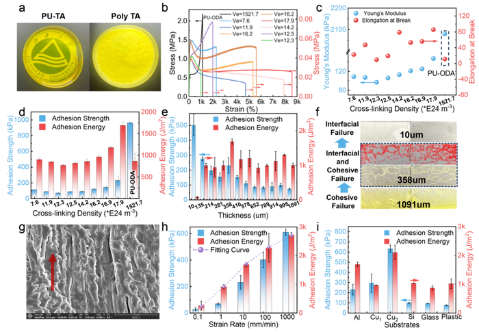 图3 PU-TA与PU-ODA弹性体性能表征 a) PU-TA与聚硫辛酸的结构示意图。 b) 无缺口样品的拉伸应力-应变曲线。 c) 不同Ve下的断裂伸长率与杨氏模量。 d) 粘附性能随Ve的变化。 e) 不同厚度样品的粘附性能。 f) 不同厚度下的断裂行为。 g) 铝基板上358 μm厚PU-TA的SEM图像。 h) 不同应变速率下的粘附性能。 i) 不同基板上的粘附性能。