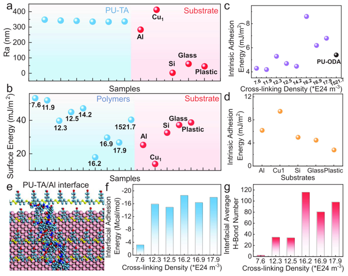 图4 PU-TA弹性体与基板的界面韧性 a) 基板与PU-TA的表面粗糙度。 b) 表面能对比。 c) 不同Ve样品在铝基板上的本征粘附能。 d) PU-TA300在不同基板上的本征粘附能。 e) PU-TA在铝基板上的构象。 f) 铝基板上的界面粘附能。 g) 界面平均氢键数量。