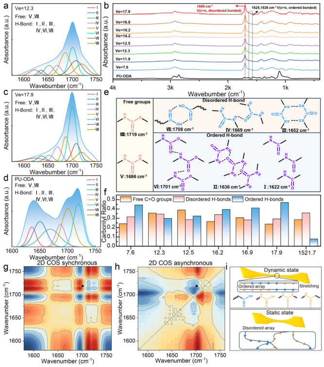 FT-IR光谱显示,PU-TA的羰基伸缩振动区存在八个子峰,对应有序/无序H键状态(图2a-d)。定量分析表明,PU-TA300的H键化羰基比例最高(图2e)。动态拉伸实验通过二维相关FT-IR谱图证实:外力作用下,游离羰基转化为有序H键(图2g-i),分子链排列增强使氢键阵列有序化,显著提升能量耗散效率。