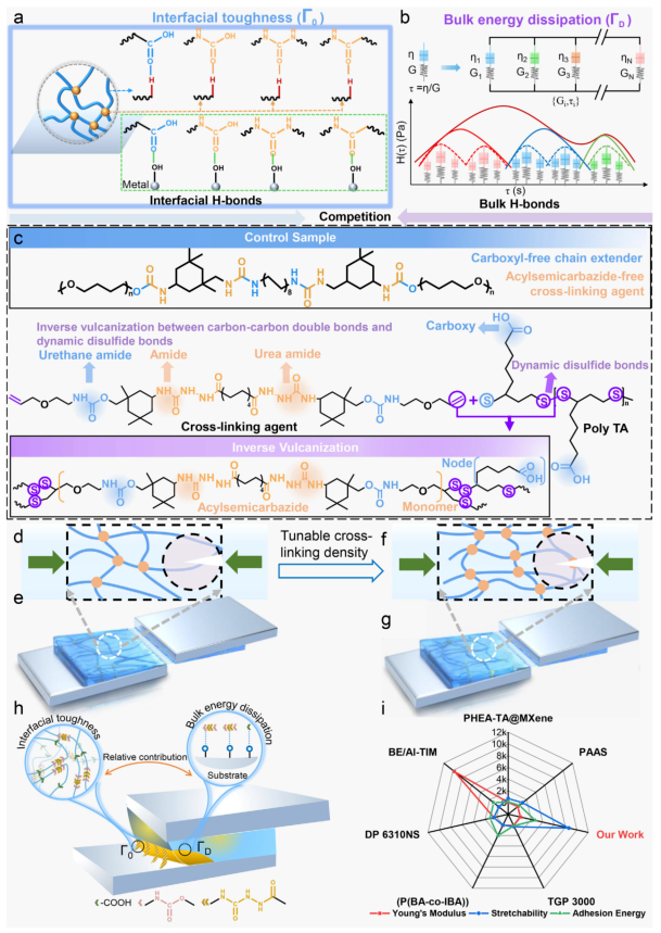 图1 基于分子工程的PU-TA弹性体设计原理 a) 本体能量耗散:麦克斯韦单元由弹簧和缓冲器组成;松弛谱H(T)包含一系列弹簧刚度和弛豫时间。 b) 界面韧性:PU-TA分子结构含多重氢键;弹性体与金属原子羟基形成界面氢键。 c) 化学交联剂与扩链剂结构。 d-g) 不同Ve下PU-TA的链网络示意图及裂纹尖端过程区;搭接剪切测试中的内聚失效模式。 h) 剪切测试中界面韧性(Γ0)与本体耗散(Γb)示意图。 i) PU-TA与代表性粘附材料的粘附能-杨氏模量-拉伸率对比。