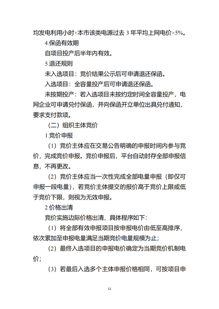 (2)机制电价,由市价格主管部门每年组织已投产和未来12个月内投产、且未纳入过机制电价执行范围的项目自愿参与竞价形成,对成本差异大的按技术类型分类组织。初期,本市各类光伏、风电、生物质发电项目原则上统一竞价。竞价时按报价从低到高确定入选项目,机制电价原则上按入选项目最高报价确定、不高于竞价上限。