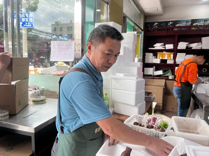 上午11点,木水花市场里的云珍菌业门店一片忙碌景象。干巴菌、鸡枞、松茸、青头菌等野生菌被整齐放在箩筐中。一名店员正在直播,热情地介绍着各种野生菌的价格、品质。旁边的工作人员则根据顾客下单情况,将菌子搭配好,并放上火腿片、大蒜、皱皮椒等配料送到打包台。负责打包的工作人员在泡沫箱底铺上冰块,垫上柔软的纸巾,再将菌子轻轻包裹,确保每一朵菌子都完好,最后进行封装。
