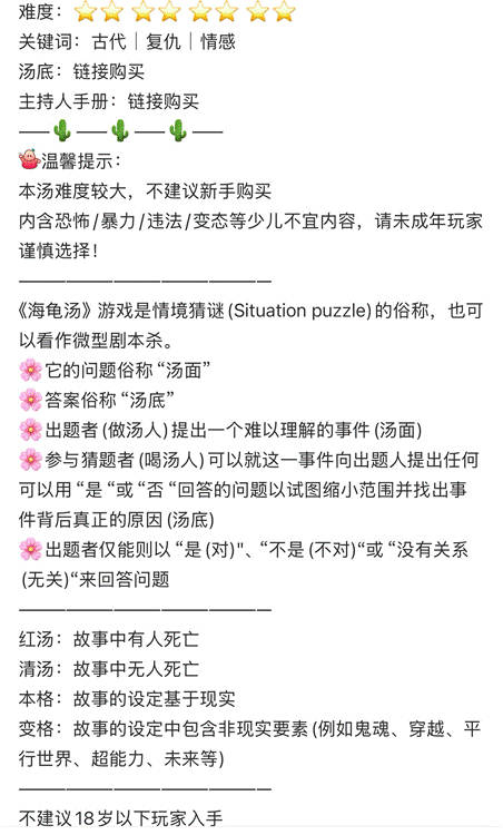 据了解,海龟汤是一种情境推理类游戏:出题者给出事件结果或片段(即“汤面”),猜题者通过可被“是/否/无关”回答的问题推理完整故事,出题者据此回应,直至猜题者得出全部真相(即“汤底”)。