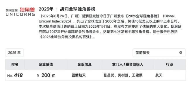 跨界者的优势,在于没有思维定式束缚。张昌武的金融背景反而成为破局关键,他深谙资本运作规律,在创业初期就系统规划技术路线与融资节奏的匹配性。当前,公司已累计获得超70亿元融资,背后不仅站着红杉资本、碧桂园创投、经纬中国等头部机构,也有国家制造业转型升级基金这样的“国家队”深度参与,豪掷9亿元创下单笔最大投资记录,凸显国家队对商业航天硬核实力的认。如今的蓝箭航天,估值已从早期的几亿元跃升至200亿元,背后是其技术壁垒与市场潜力的双重兑现。胡润研究院的《2025全球独角兽榜》显示,蓝箭航天位列第418位,估值与SpaceX早期阶段相当。
