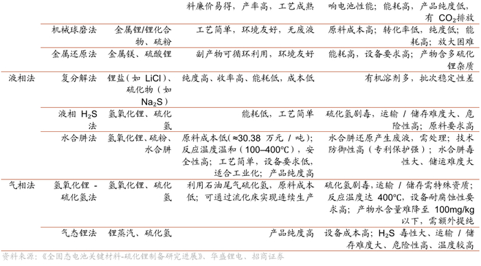 硫化锂制备路线较多,量产壁垒高。硫化锂是硫化物电解质主要原材料,是决定其性能和成本的关键。硫化锂生产工艺难度高,当前市价超300万元/吨,在电芯成本占比中超过50%(传统锂电池电解液成本占比仅5%)。目前国内硫化锂厂商多属于中试线规模,未来围绕硫化氢的环评要求或壁垒,可能是量产过程中的重要难题。硫化锂理论上的工艺路线比较多,在纯度、颗粒度、形貌、排放方面差异较大,目前实际使用的以固相法为主;液相法具有能耗低、连续化生产等优势,理论上成本优势明显,如果纯度等问题解决,有应用潜力。