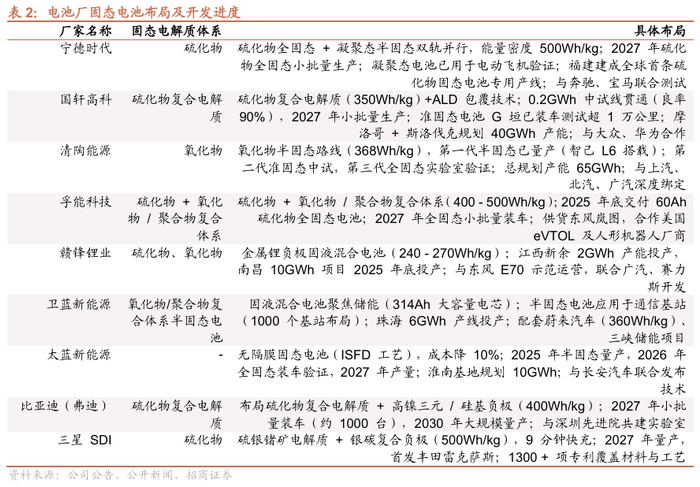 全固态电池产业化加速。近几年全固态电池发展显著加速,主流参与者纷纷开始大力度投入。宁德时代预计2027年全固态小批量生产,30年前后有望大批量应用。比亚迪弗迪电池研发硫化物复合电解质体系,预计2027年小批量装车、2030年大规模量产,目前已实现中试线生产。亿纬锂能、国轩高科、孚能科技等企业也陆续开始贯通中试线。车企方面,上汽、广汽、奇瑞、比亚迪、东风等车企预计26年开始陆续实现全固态电池装车。此外evtol,机器人等新兴市场,也带来了固态电池的边际需求。