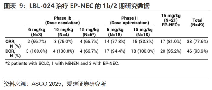 公司在ASCO 2025大会上汇报了LBL-024联合依托泊苷/铂类化疗一线治疗晚期肺外神经内分泌癌EP-NEC的1b/2期研究数据。在15mg/kg剂量下,患者ORR为83.3%,DCR达到100%,PFS尚未成熟(中位随访期为8.2个月),而根据历史数据,单纯化疗的ORR在30%-55%之间;在安全性方面,LBL-024联合化疗的耐受性良好,所有剂量组均为报告剂量限制毒性DLT,治疗相关不良反应TEAE以1-2级为主,最常见的TEAE为化疗相关的血液学毒性、恶心。由于EP-NEC目前缺乏标准疗法,2024年4月NMPA批准LBL-024开展单臂关键注册临床研究,并于同年10月获得突破性疗法BTD认定,11月获FDA孤儿药ODD认定。