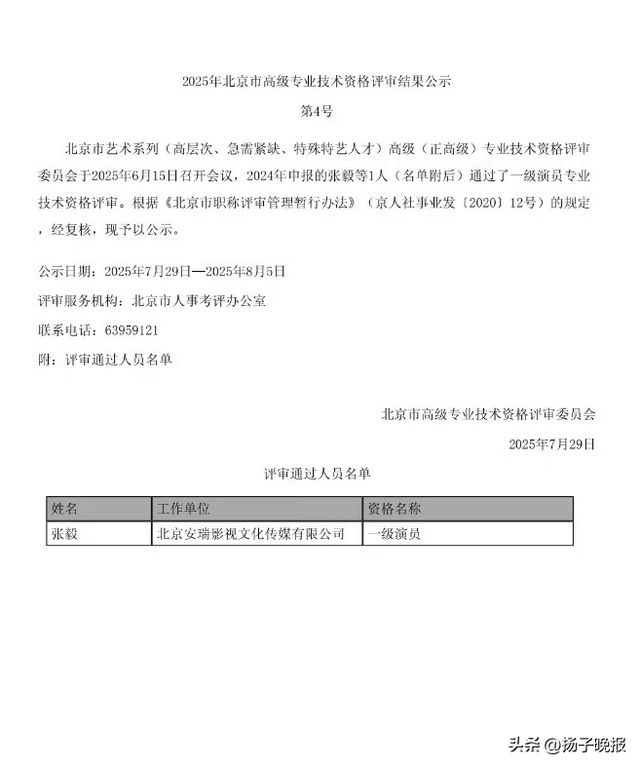 公示显示,北京市艺术系列(高层次、急需紧缺、特殊特艺人才)高级(正高级)专业技术资格评审委员会于2025年6月15日召开会议,2024年申报的张毅等1人(名单附后)通过了一级演员专业技术资格评审。根据《北京市职称评审管理暂行办法》(京人社事业发(2020)12号)的规定,经复核,现予以公示。公示日期为2025年7月29日-2025年8月5日。