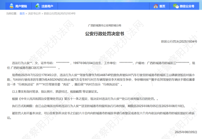 八桂警察阳光执法网发布公安行政处罚决定书,内容如下: