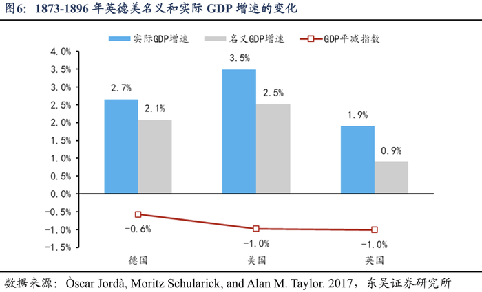 从经济增长来看,1873-1896年,美国实际GDP年均增长3.5%,名义GDP年均2.5%,GDP平减指数年均-1.0%;德国和英国在此期间的GDP平减指数分别为-0.6%和-1.0%。
