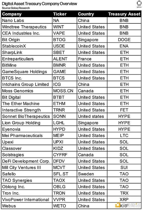 新入场者正将投资组合多元化至 BTC 和 ETH 之外。金库公司已开始持有至少十种其他数字资产,包括 SOL、XRP、BNB 和 HYPE 等。