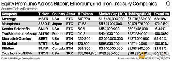 下表通过截面数据对比了 8 家持有大量公开披露数字资产、且具有相当市值的 BTC/ETH/TRX 金库公司(数据截至 7 月 28 日),突显了这种差异。