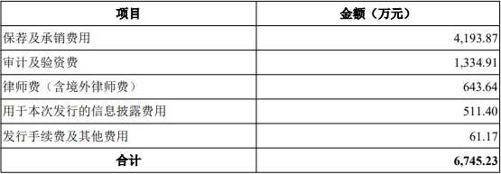 汉桑科技本次发行费用(不含增值税)总额为6,745.23万元,其中,保荐及承销费用为4,193.87万元。