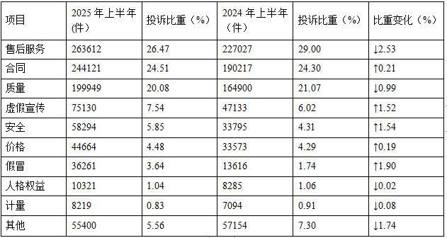 与2024年上半年相比(如表1所示),假冒、安全、虚假宣传问题投诉比重上升,售后服务、质量、计量问题投诉比重下降。