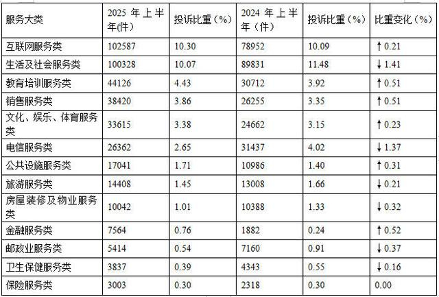根据2025年上半年服务大类投诉数据(如图3、表3所示),互联网服务类,生活及社会服务类,教育培训服务类,销售服务类,文化、娱乐、体育服务类居于前五位。与2024年上半年相比,金融服务类、教育培训服务类、销售服务类投诉比重上升,生活及社会服务类、电信服务类投诉比重下降。