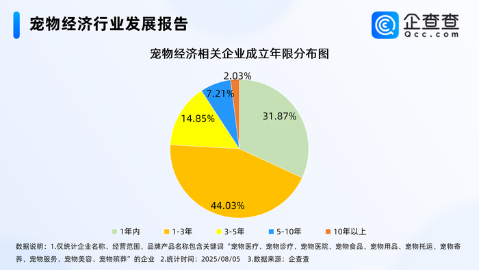 企查查数据显示,从经营时间来看,宠物经济相关现存企业多集中成立在近三年,成立年限在1-3年的相关企业最多,占比44.03%。其次,成立年限在1年内的相关企业占比31.87%。