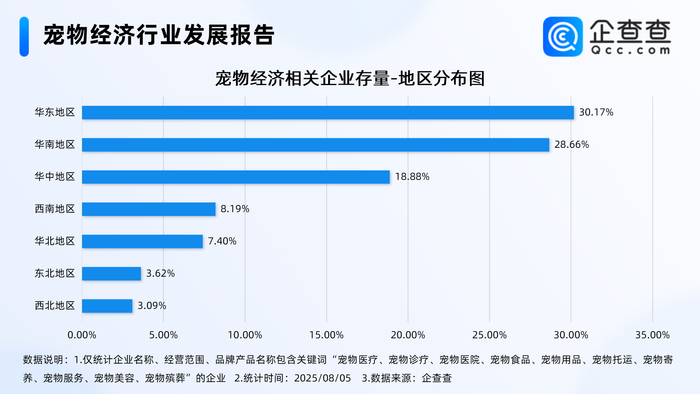 企查查数据显示,从地区分布来看,宠物经济相关企业主要分布在华东地区、华南地区,分别占比30.17%、28.66%。其次,分布在华中地区的相关企业占比18.88%。
