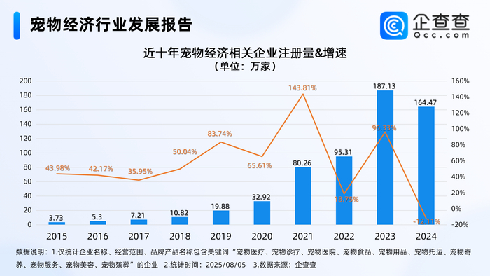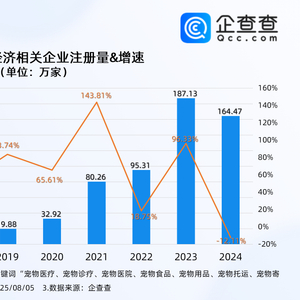 企查查数据显示,截至8月初,国内现存宠物经济相关企业472.69万家。近十年相关企业注册量呈快速增长态势,其中2021年全年注册80.26万家,同比增长143.81%,达近十年注册量增速峰值。2023年全年注册量首次突破百万家,达187.13万家,同比增长96.33%。2024年全年注册164.47万家相关企业,虽较前一年有所下滑,但仍处于高位。截至目前,今年已注册96.55万家,其中前7月注册95.39万家,同比略增1.67%。